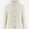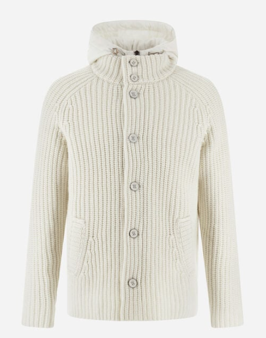 Cardigan in pure wool carded yarn with cob stitch work. The contemporary attitude of the garment is enhanced by the removable hooded bib, finished in recycled nylon microfiber with a light coating on the reverse side that makes the texture waterproof. Regular fit withbutton closure,removable hooded bib with double-slider zipper ,weltpockets.