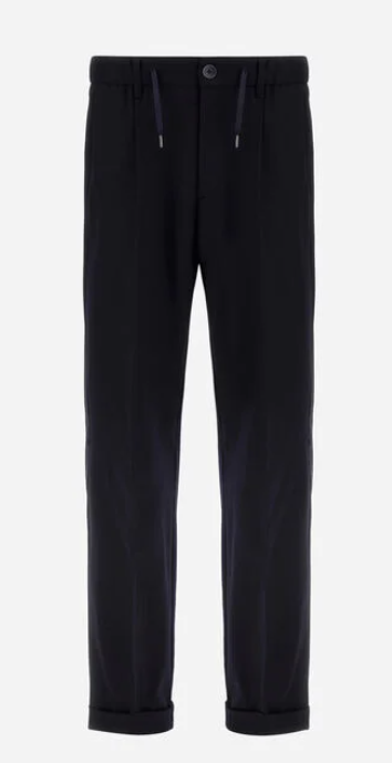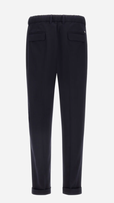 Stretch-textured wool-blend gabardine pants , regular cut and elastic waist insert provides maximum comfort .This model combines style and functionality to to enrich the casual wardrobe . French pockets on the front and flap pockets on the back . Turn-ups at the bottom .