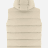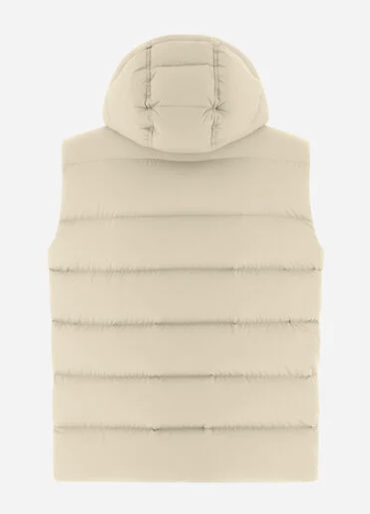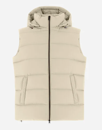 Sleeveless made of recycled nylon microfiber with a light coating on the reverse side that makes the texture waterproof, soft to the touch and matte-looking.