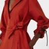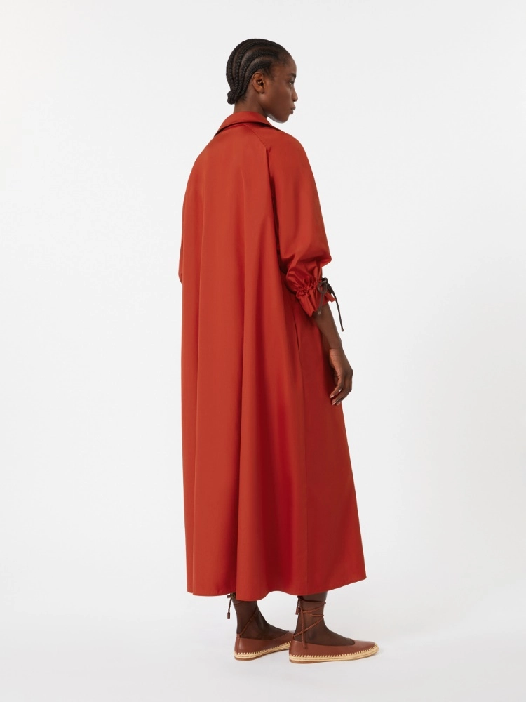 Abito lungo dal volume ampio, caratterizzato da coulisse tubolari in pelle inserite nei polsi con occhielli in corno e finalini in metallo.