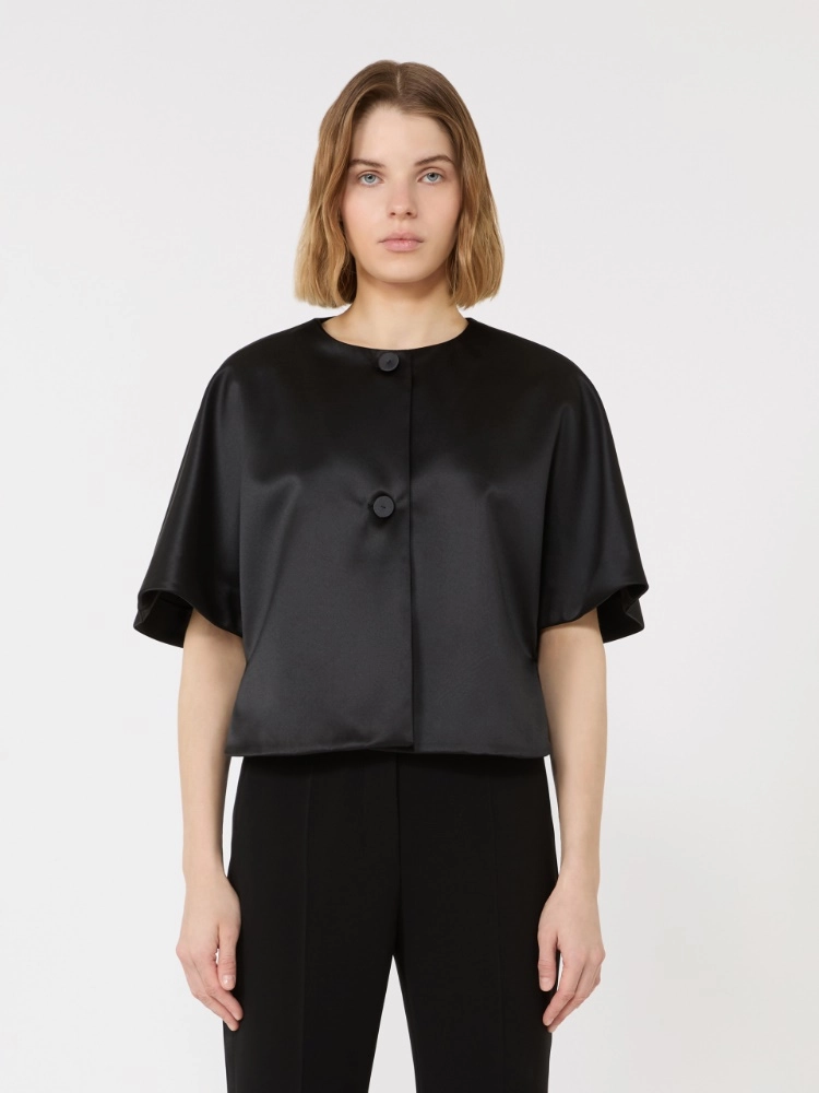 Cappa girocollo, rifinita da fiocco couture rimovibile sul retro del collo.