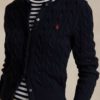 Questo cardigan aderente a girocollo, realizzato in puro cotone dalla classica lavorazione a trecce, sfoggia l’esclusivo pony ricamato sul torace.