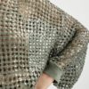 Il pregiato filato è caratterizzato dalla combinazione di seta e lino che dà vita a una rete dall’aspetto rustico e al contempo raffinato. Il filato è impreziosito da un ricamo di paillettes.