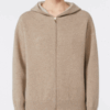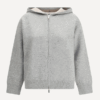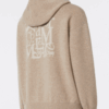 Cardigan in filato tubolare di lana e cachemire bicolore con cappuccio e motivo intarsiato a contrasto sulla schiena. Maniche lunghe con spalla scesa e chiusura frontale con zip a doppio cursore . Polsi e fondo a costine .