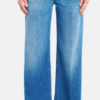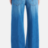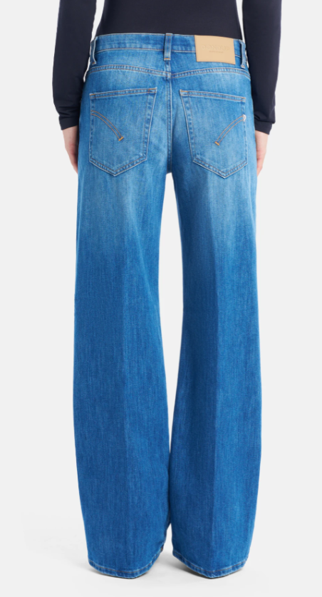 Jeans modello “Jacklyn” cinque tasche wide leg fit, vita bassa, gamba a palazzo. Denim stretch . Lavaggio medio con micro rotture. Logo Dondup. Made in Italy