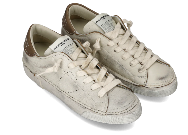 Sneaker in pelle effetto vintage e cuciture a vista. Soletta interna imbottita ed estraibile, fodera traspirante in spugna di cotone. Fasciatura rifinita artigianalmente e suola in gomma.